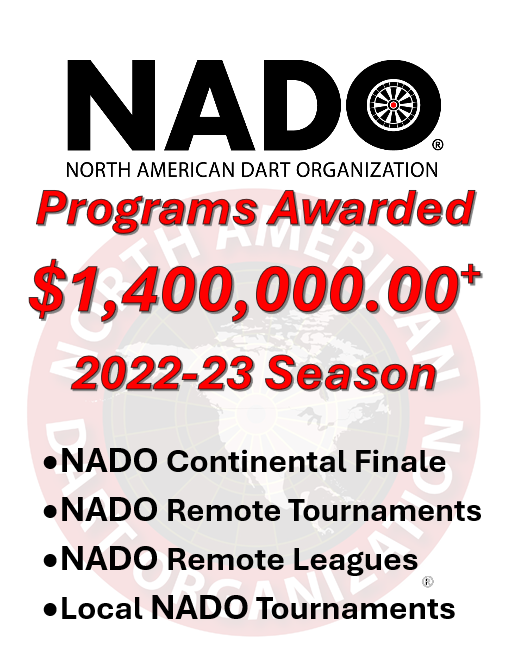 The North American Dart Organization (NADO) is a network of coin-operated dart league operators that utilize a unique player rewards program to promote the sport of soft tip electronic darts. What makes this program unique is that players are rewarded for both participation and skill with a major focus on participation. Skill will always be a factor in determining the outcome of the game but our focus on participation means that many players with modest levels of skill will have an opportunity to earn much larger rewards than are typically available to them from other events.