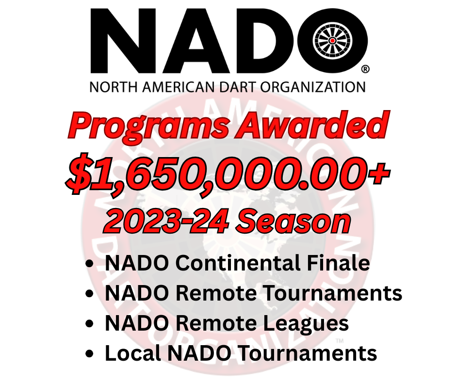 The North American Dart Organization (NADO) is a network of coin-operated dart league operators that utilize a unique player rewards program to promote the sport of soft tip electronic darts. What makes this program unique is that players are rewarded for both participation and skill with a major focus on participation. Skill will always be a factor in determining the outcome of the game but our focus on participation means that many players with modest levels of skill will have an opportunity to earn much larger rewards than are typically available to them from other events.