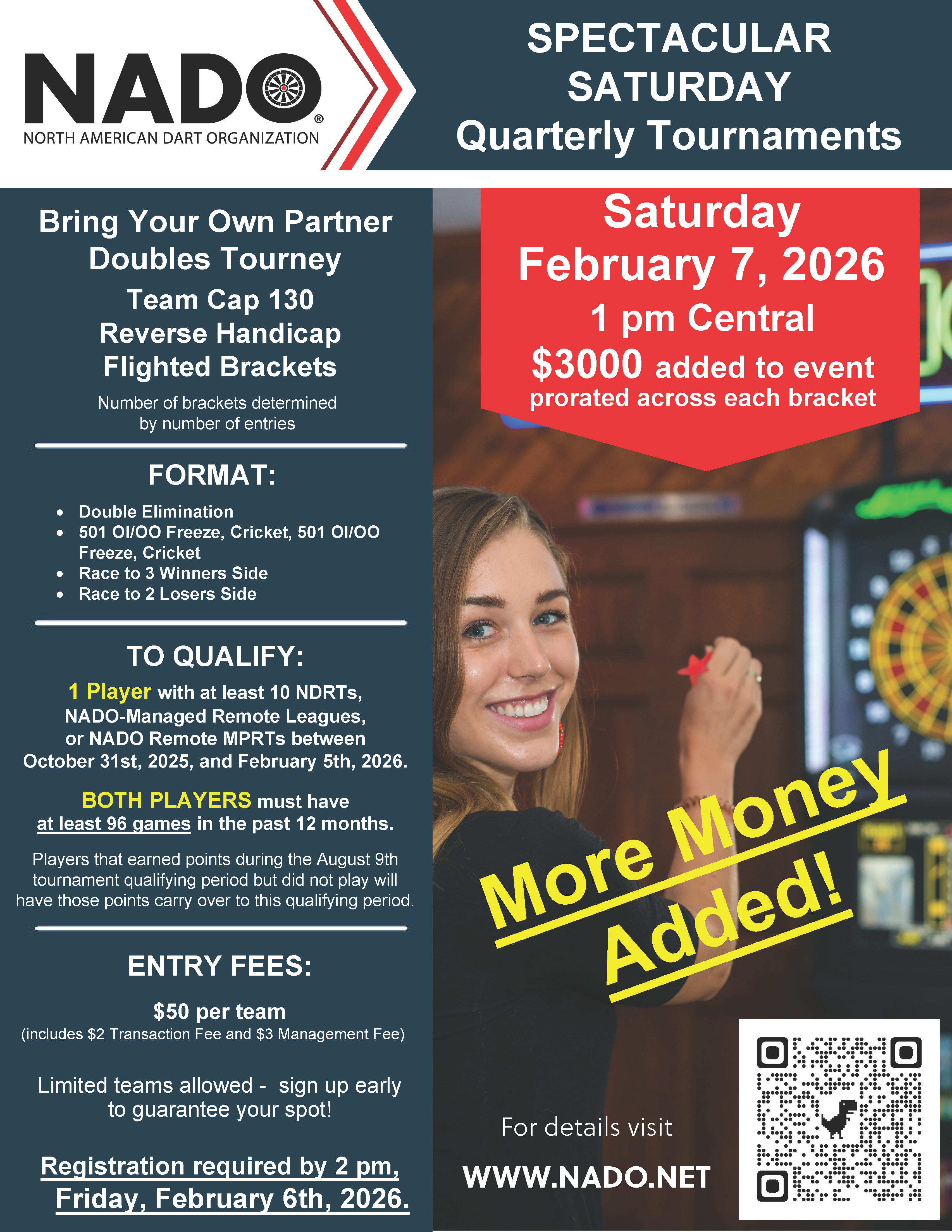 One player on a team must have played 10 league nights in a NADO Managed Remote League or in 10 Daily Remote Tournaments or in 10 NADO Remote MPRTs or a combination of NADO Managed Remote League nights/Daily Remote Tournaments/NADO Remote MPRTs equal to 10 in the preceding quarter and both players must have at least 96 NADO league games in the previous 12 months.